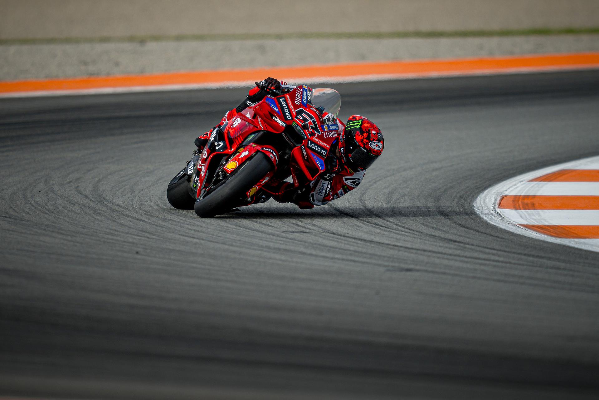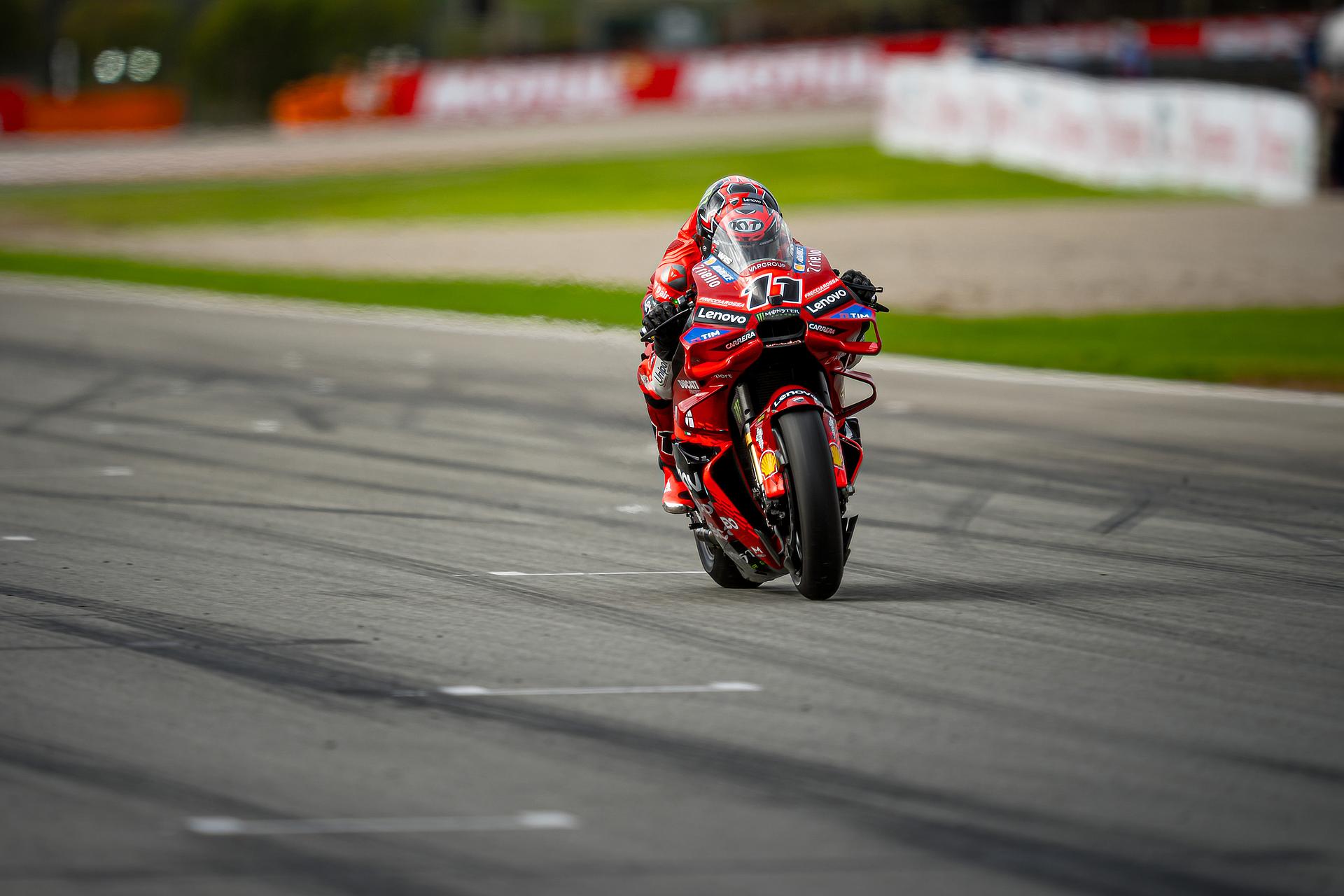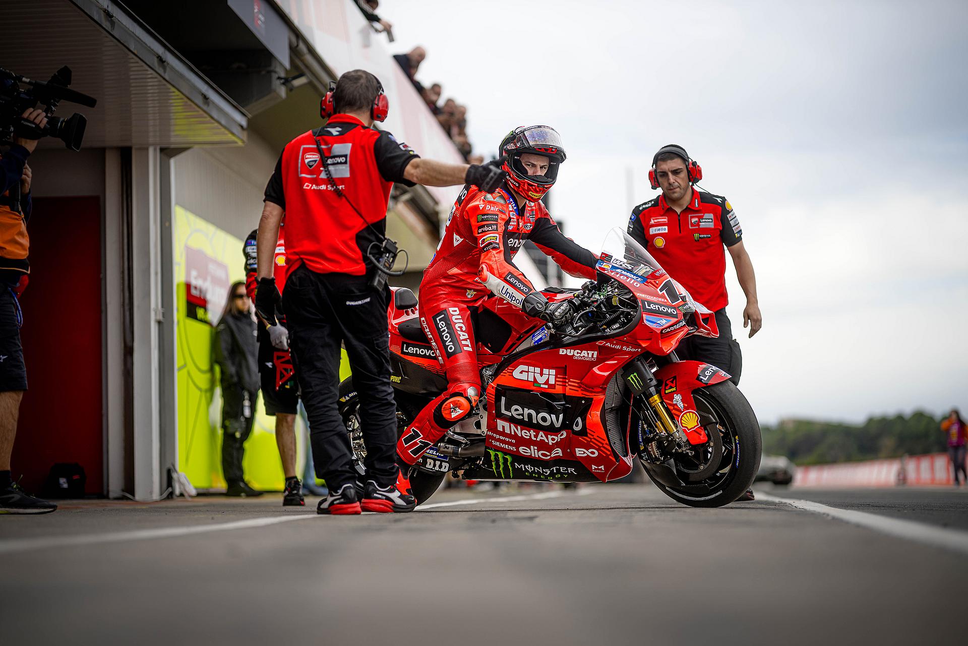 Nach einem vielversprechenden zweiten Platz im FP2 wurde Bagnaia in Q1 am Samstag durch ein Problem beeinträchtigt und beendete Qualifying 1 als Sechzehnter in der Startaufstellung für den Sprint und den Grand Prix am Sonntag. Im anschließenden Sprint kämpfte sich Pecco in den ersten Runden auf den dreizehnten Platz vor, bevor er als Vierzehnter ins Ziel kam. Nicolò Bulega – von Platz zweiundzwanzig gestartet – arbeitete sich auf den sechzehnten Platz vor und fuhr mit seiner Desmosedici GP ein konstantes Tempo.