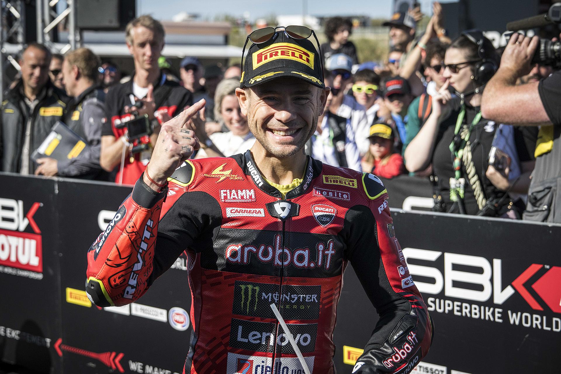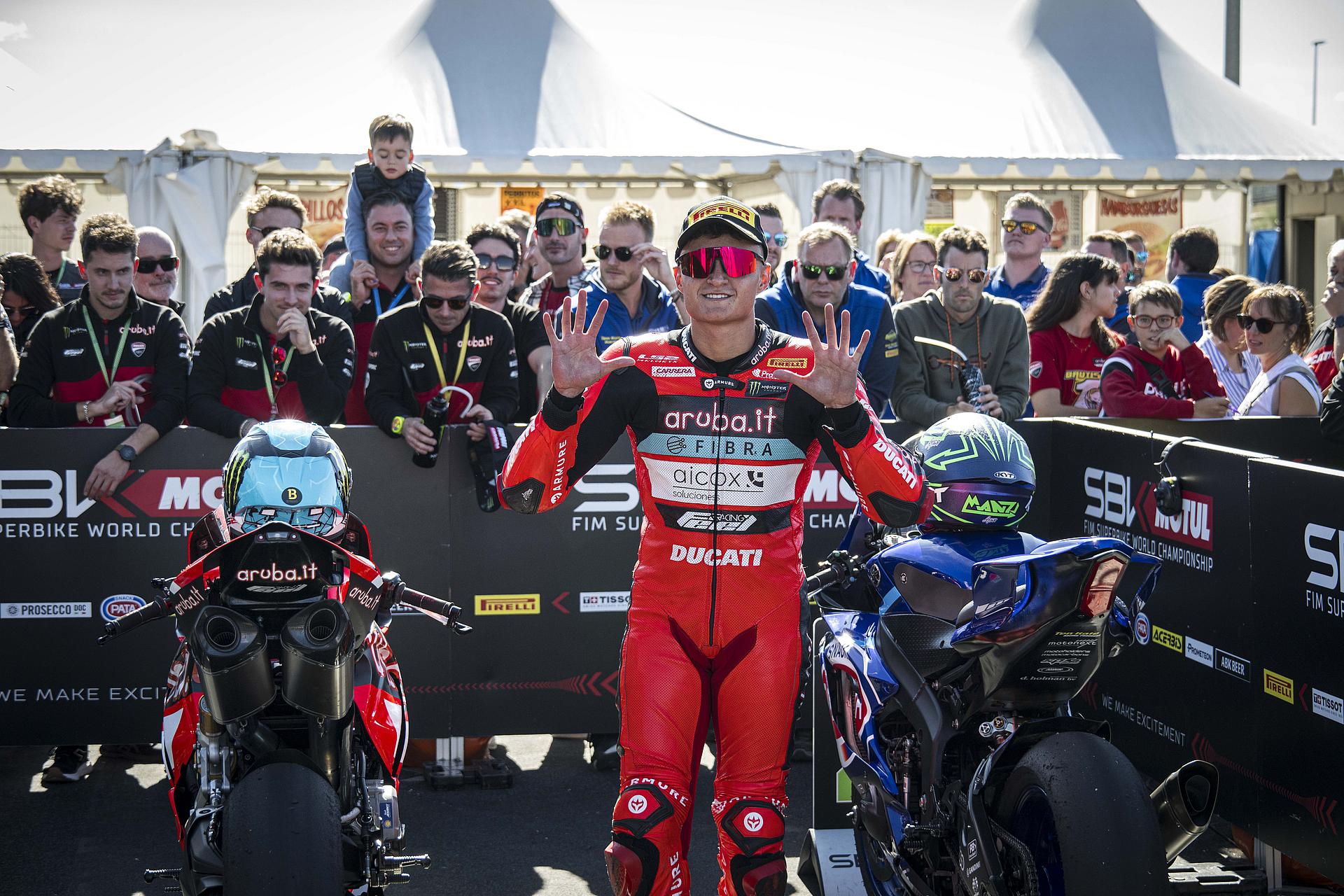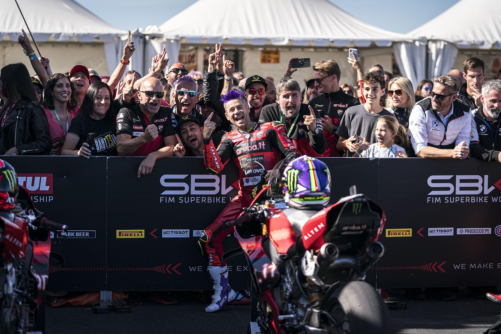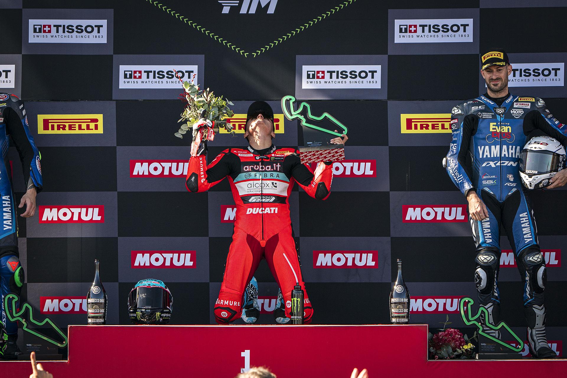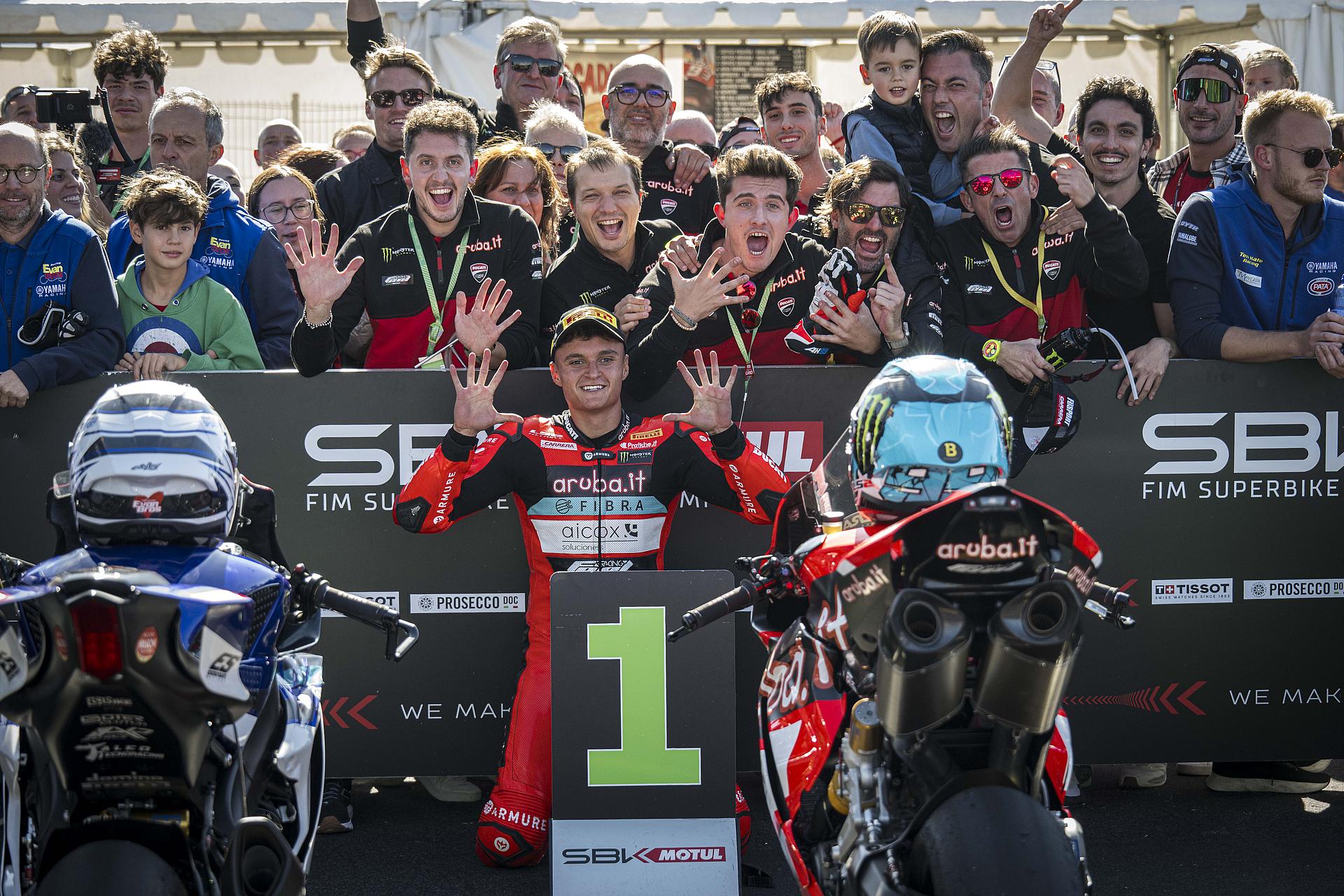 Der spanische Fahrer gewinnt das Superpole-Rennen am Vormittag, nachdem er lange Zeit mit seinem Teamkollegen Nicolò Bulega und dann mit Razgatlioglu (BWM) gekämpft hat, den er in der letzten Runde mit einem spektakulären Überholmanöver überholen kann.