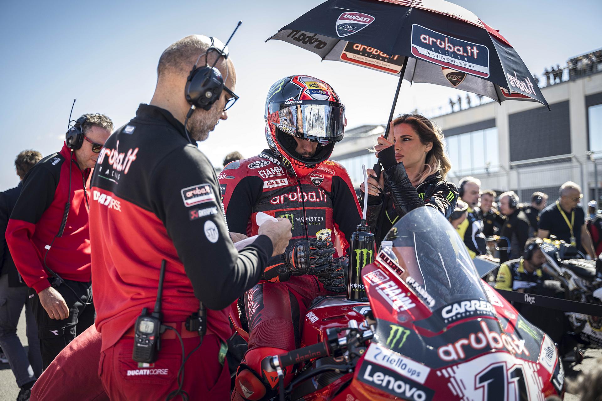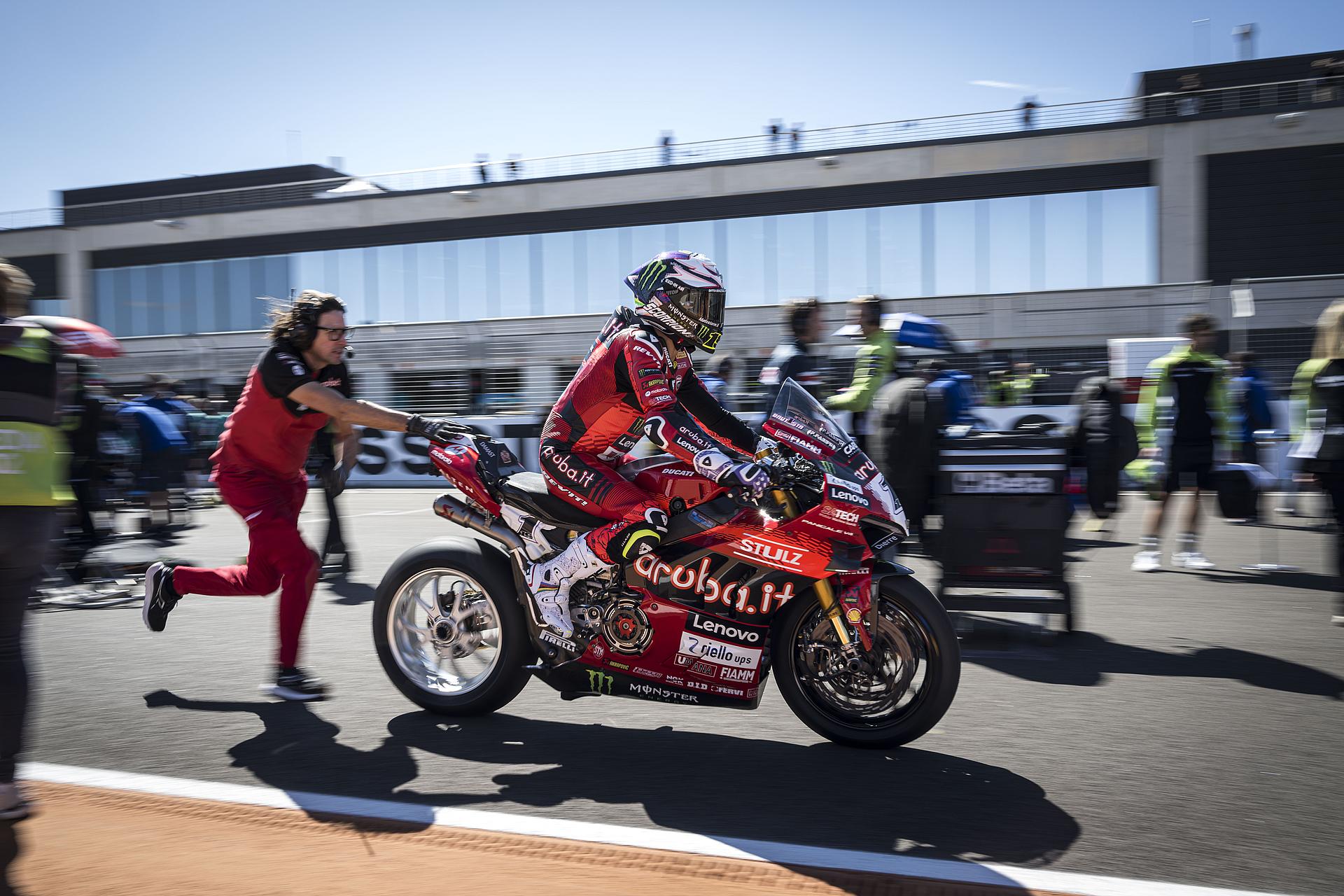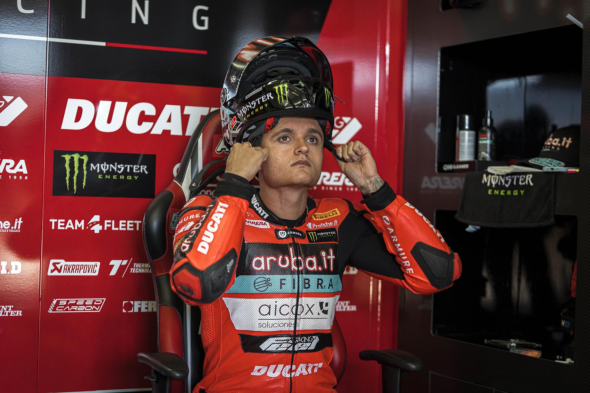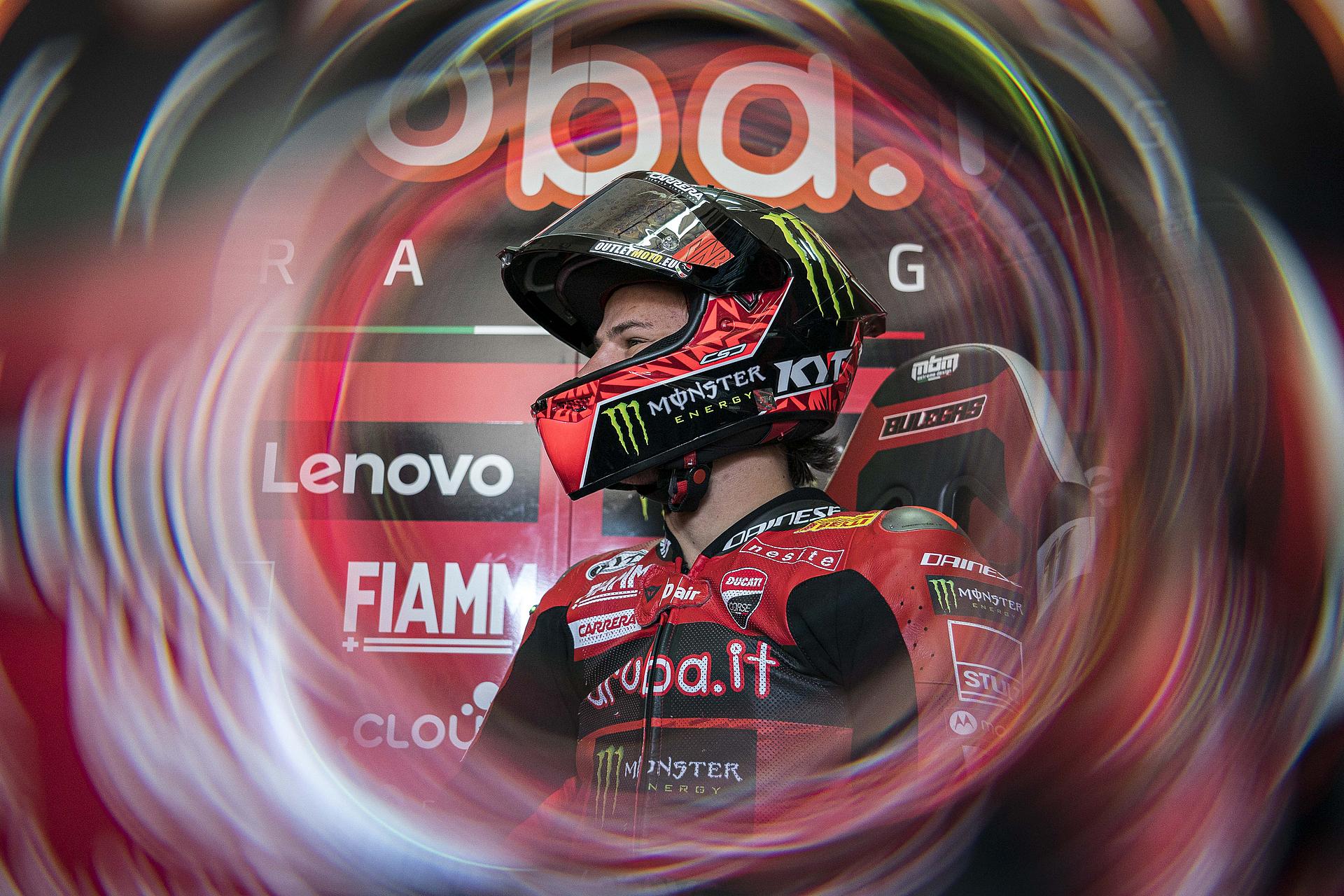 Nach der roten Flagge wegen des technischen Problems von Lowes (Ducati) in der ersten Runde kehrt Nicolò Bulega auf die Strecke zurück, um sich auf die Pole-Position zu begeben, doch bereits auf den ersten Metern der Erkundungsrunde bemerkt er ein ungewöhnliches Verhalten seiner Ducati Panigale V4 und muss damit aufhören.
