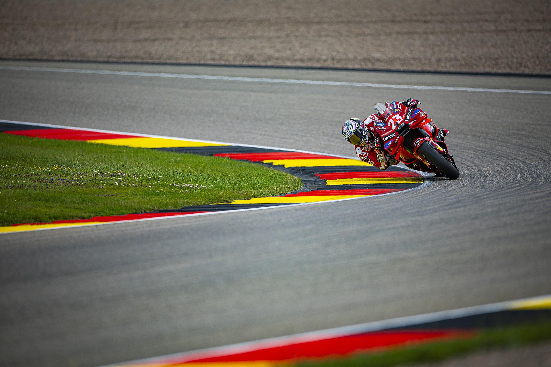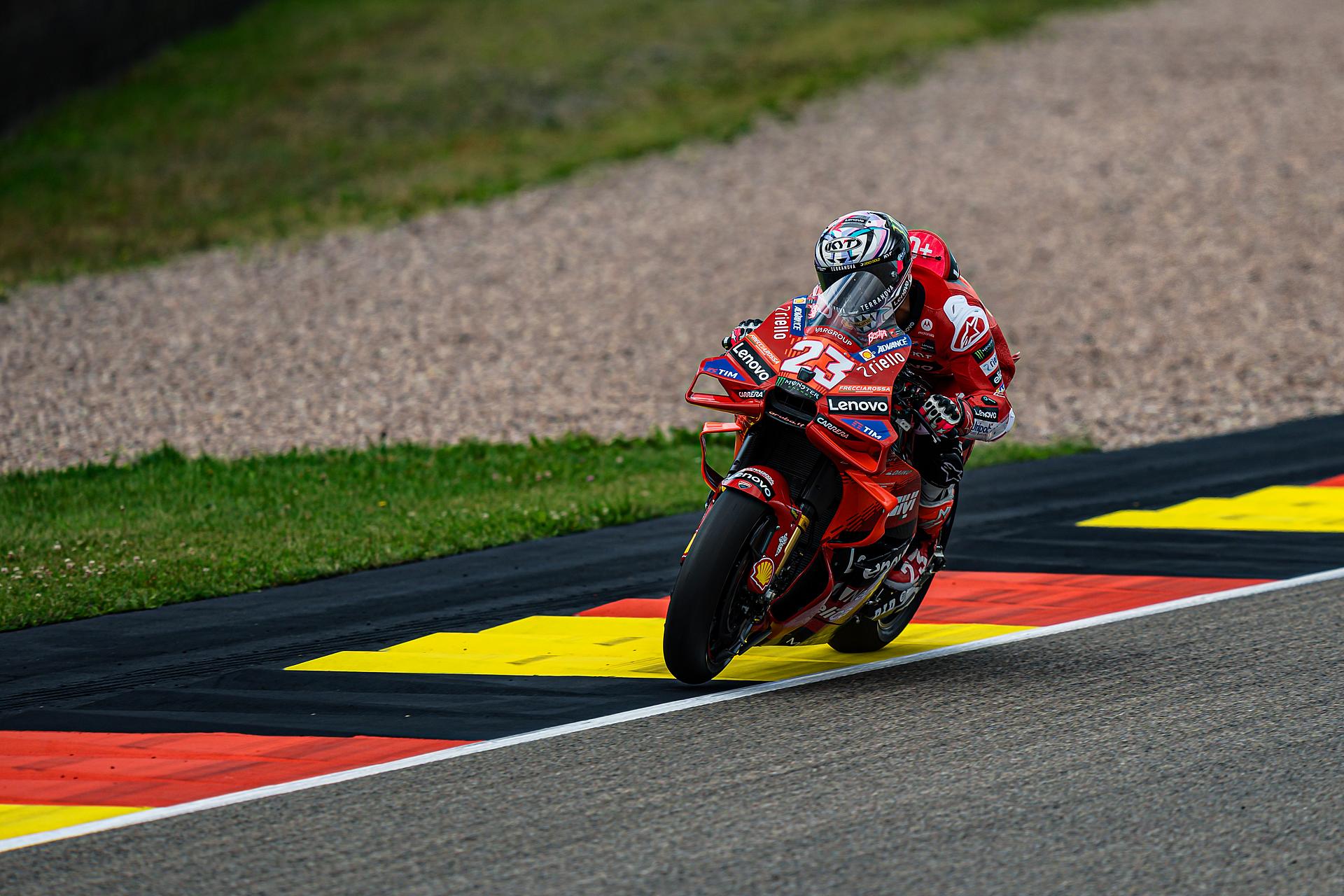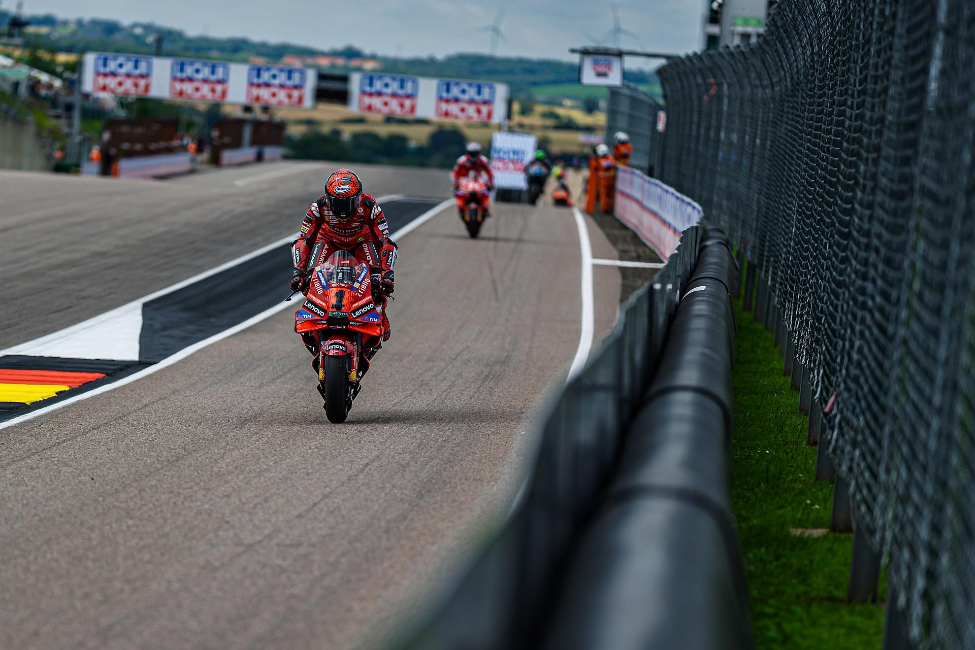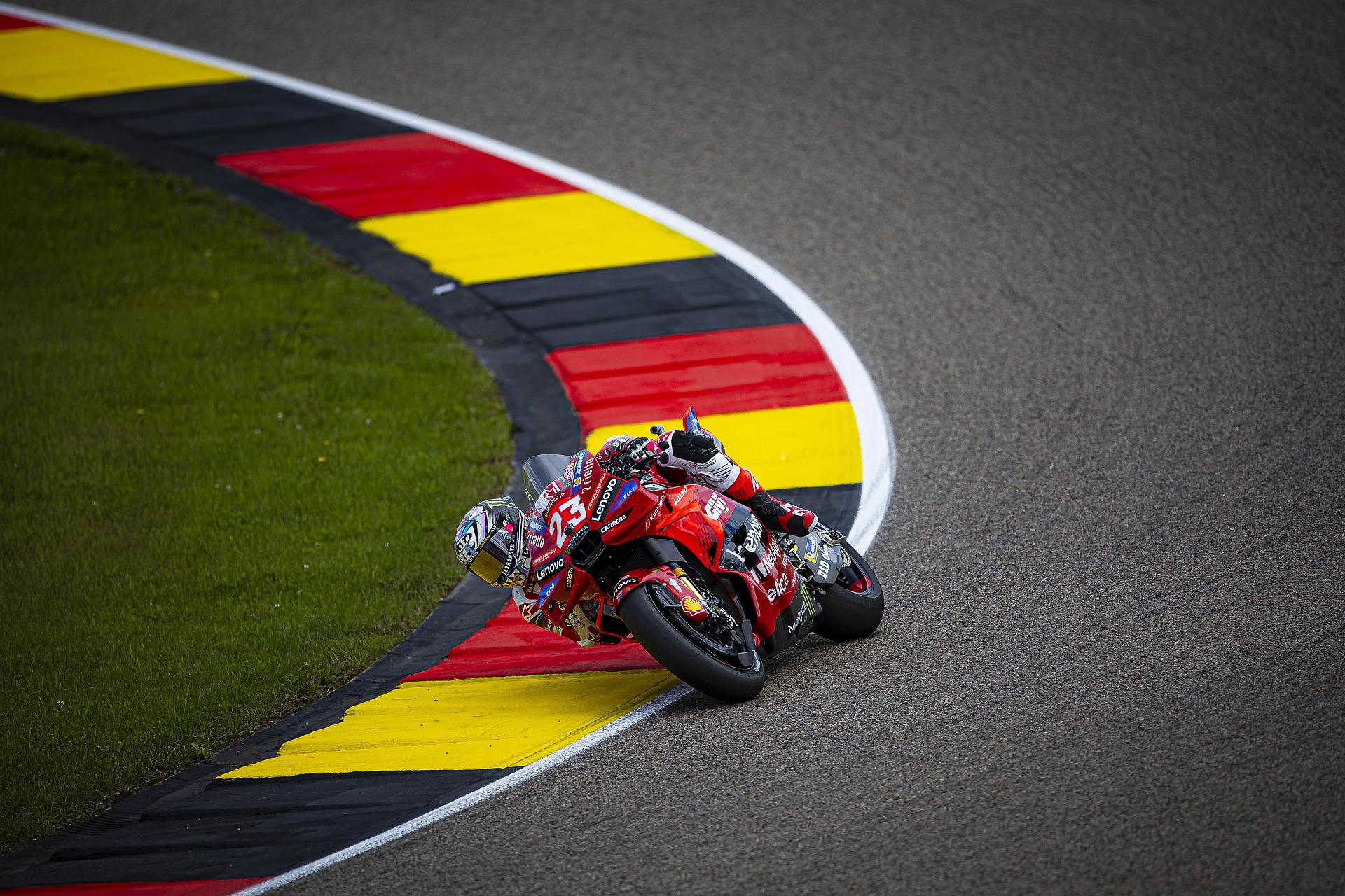 Das Ducati Lenovo Team schaffte es heute dank Francesco Bagnaia, der im 15-Runden-Sprintrennen auf dem Sachsenring als Dritter ins Ziel kam, auf die unterste Stufe des Podiums. Enea Bastianini gelang eine gute Aufholjagd aus der dritten Startreihe und blieb bis zur letzten Runde im Kampf um das Podium.
