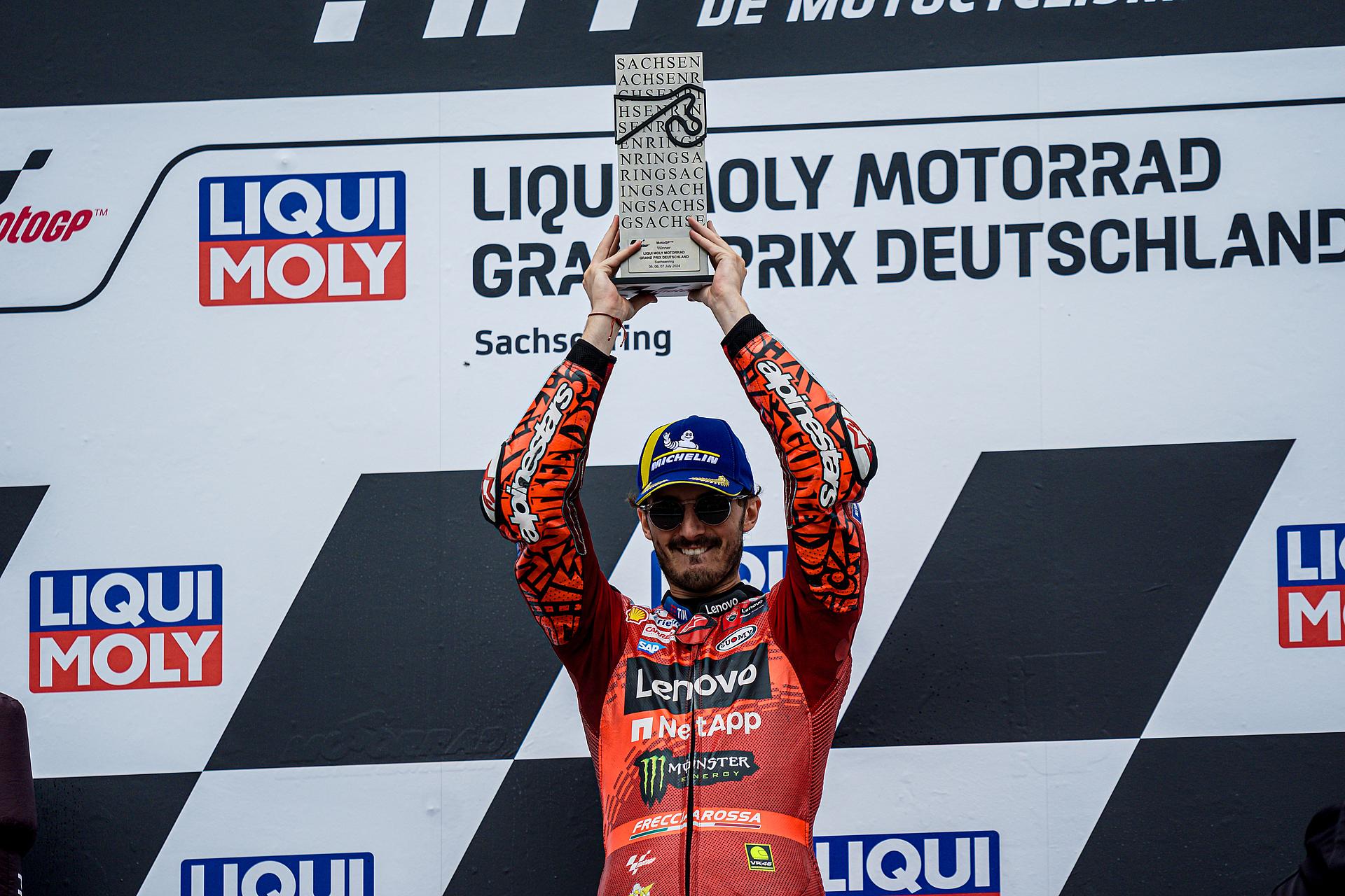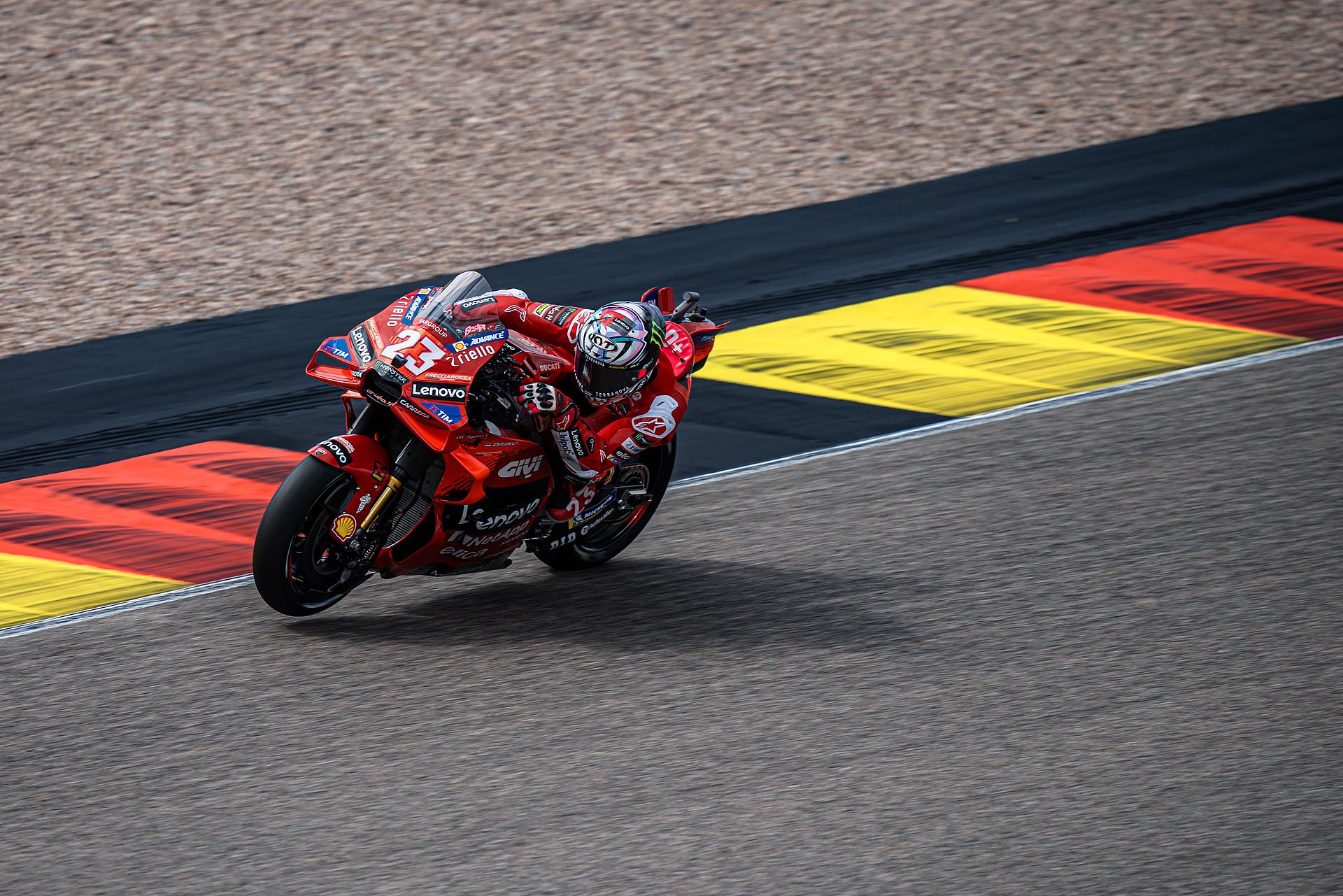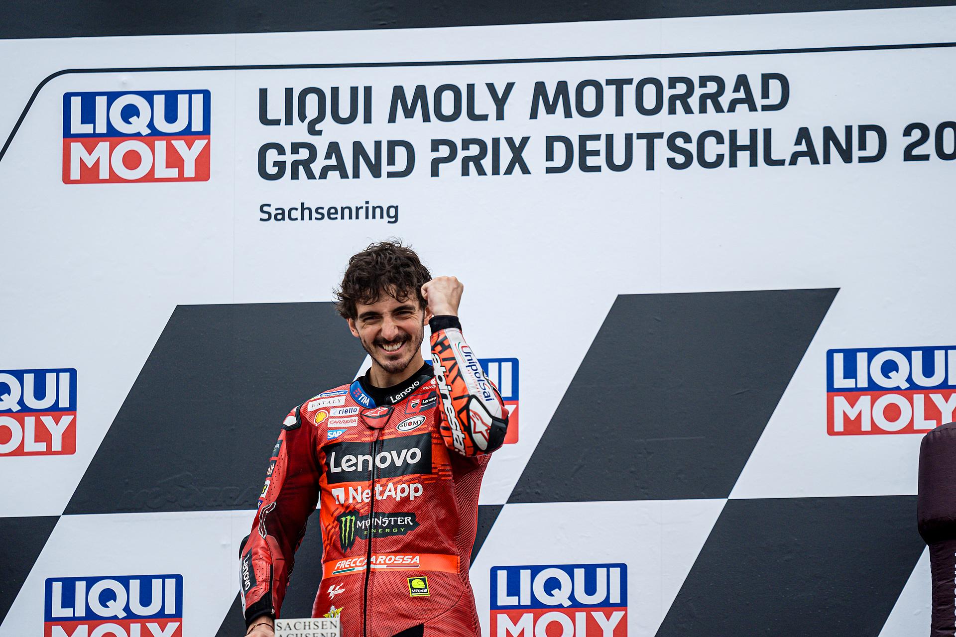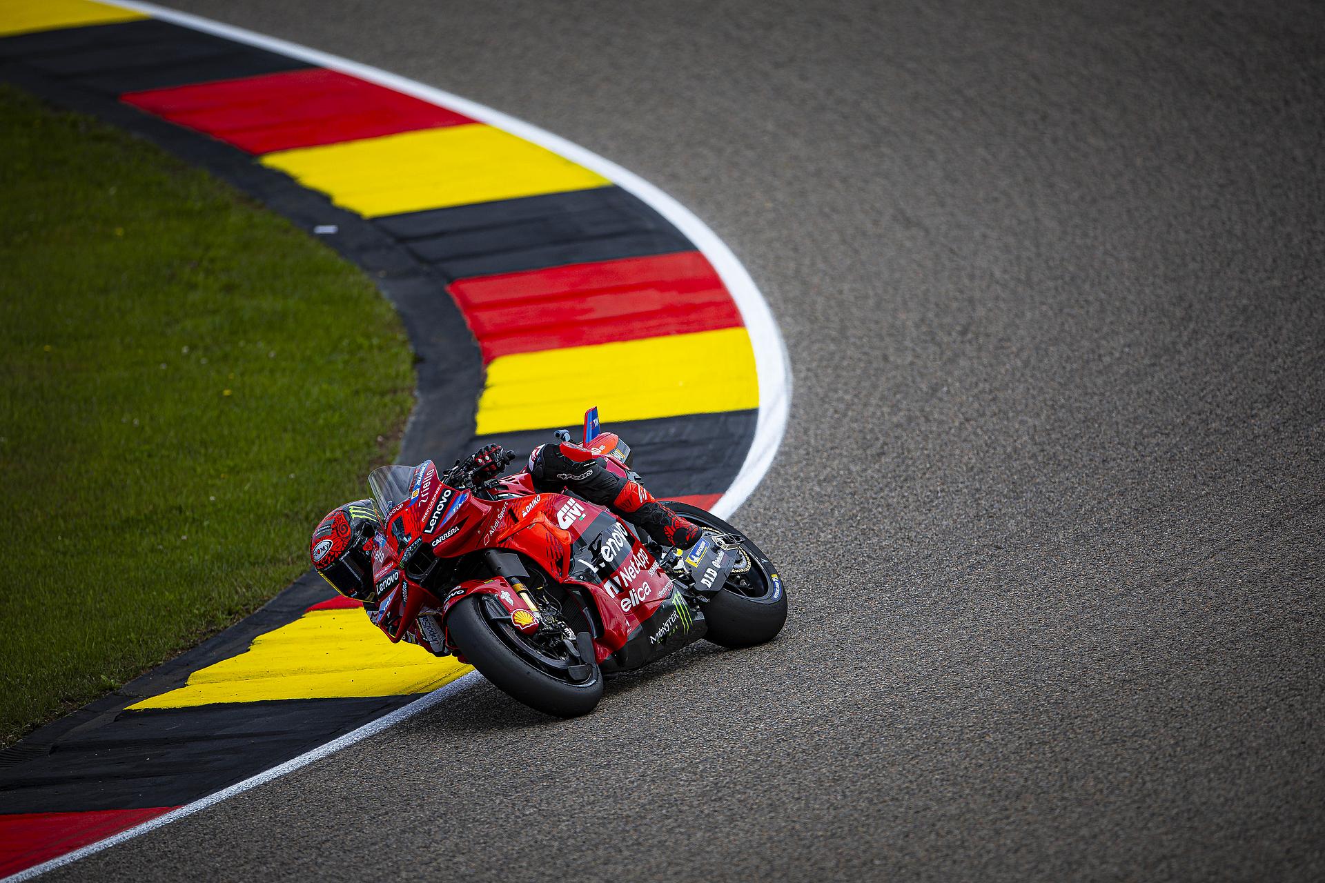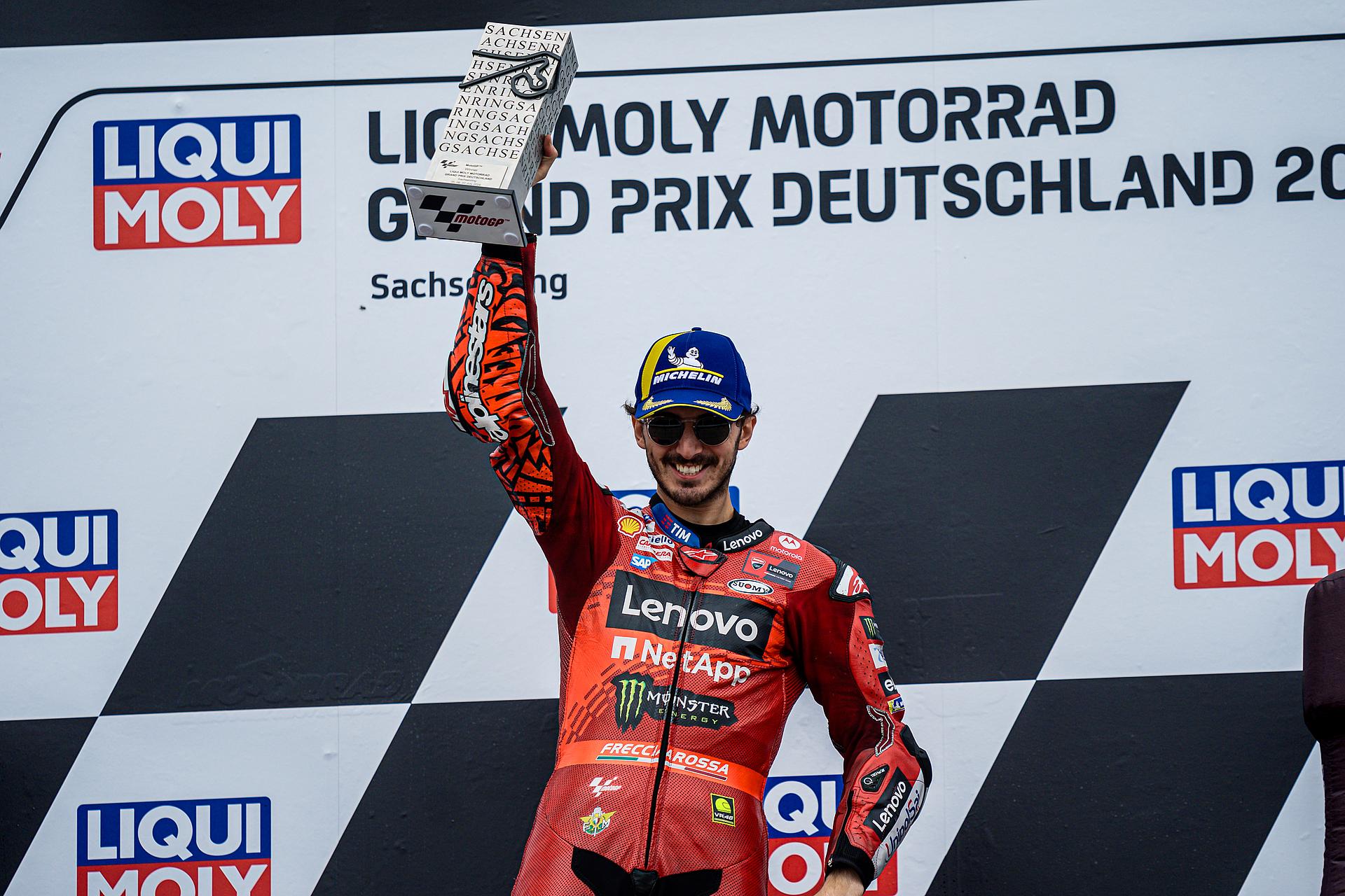 Das Ducati Lenovo Team schaffte es heute dank Francesco Bagnaia, der im 15-Runden-Sprintrennen auf dem Sachsenring als Dritter ins Ziel kam, auf die unterste Stufe des Podiums. Enea Bastianini gelang eine gute Aufholjagd aus der dritten Startreihe und blieb bis zur letzten Runde im Kampf um das Podium.