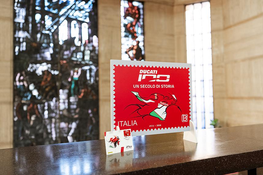 Diese Elemente vereinen sich in der Gedenkbriefmarke zum hundertjährigen Jubiläum, auf der ein ikonisches Ducati-Motorrad – die Ducati Superleggera V4 Centenario Tricolore – in den Farben der italienischen Flagge abgebildet ist: eine Hommage an die Identität des Unternehmens und seine tiefe Verbundenheit mit der Kreativität, der technologischen Innovation und der Tradition des Landes.