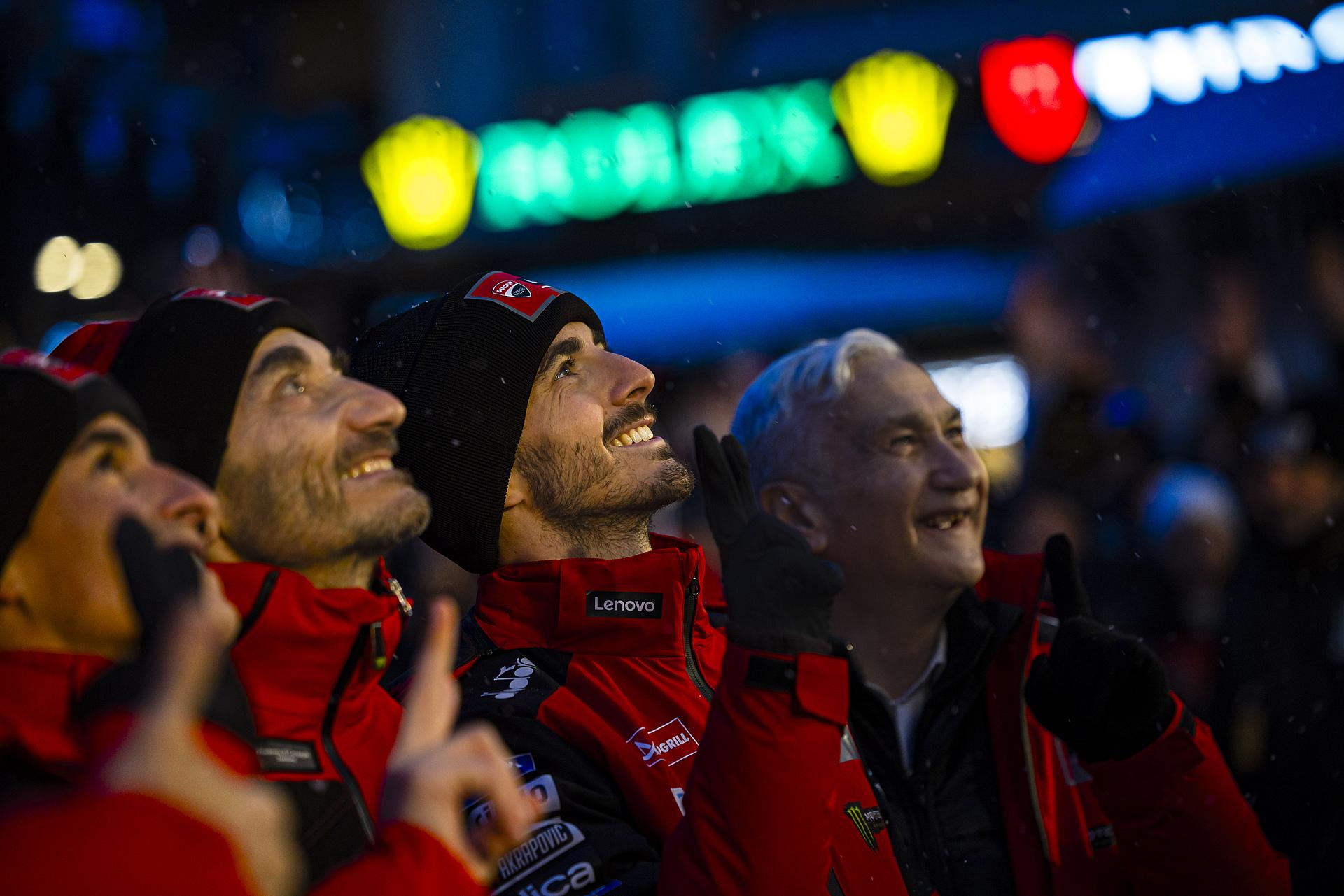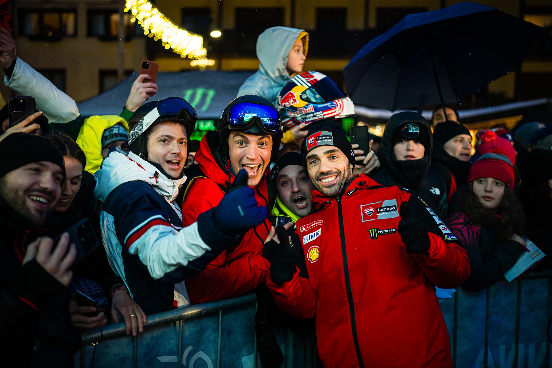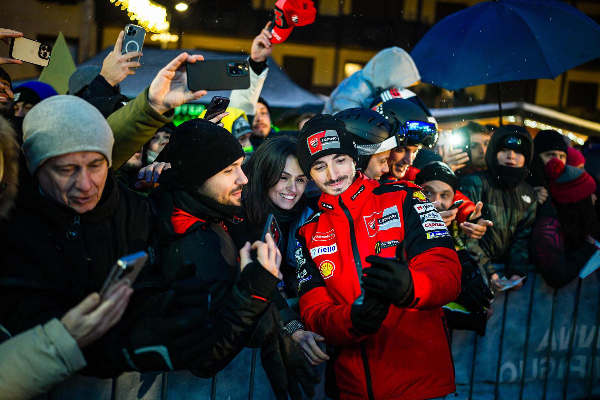 Bagnaia und Márquez waren seit ihrer Ankunft in Madonna di Campiglio am Sonntag, 19. Januar, die unbestrittenen Stars der Veranstaltung. Der erste Termin war die offizielle Präsentation des Teams und der Desmosedici GP25 #63 und #93, die am Morgen des Montag, 20. Januar, auf dem PalaCampiglio mit einem Live-Streaming auf den digitalen Kanälen von Ducati und Live-TV-Übertragung stattfand. Am Nachmittag trafen die beiden Champions in Begleitung des offiziellen Ducati-Testers Michele Pirro, des Ducati-CEO Claudio Domenicali, des Ducati Corse Sporting, Marketing & Communications Director Mauro Grassilli und des Ducati Lenovo Team Managers Davide Tardozzi die Fans, die sich auf der Piazza Sissi versammelt hatten.