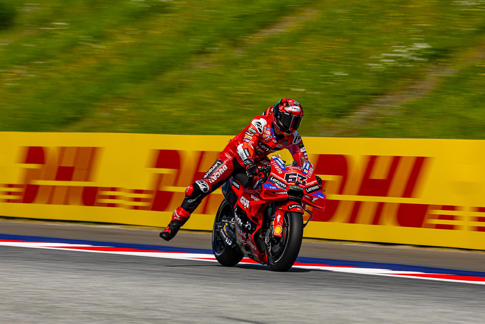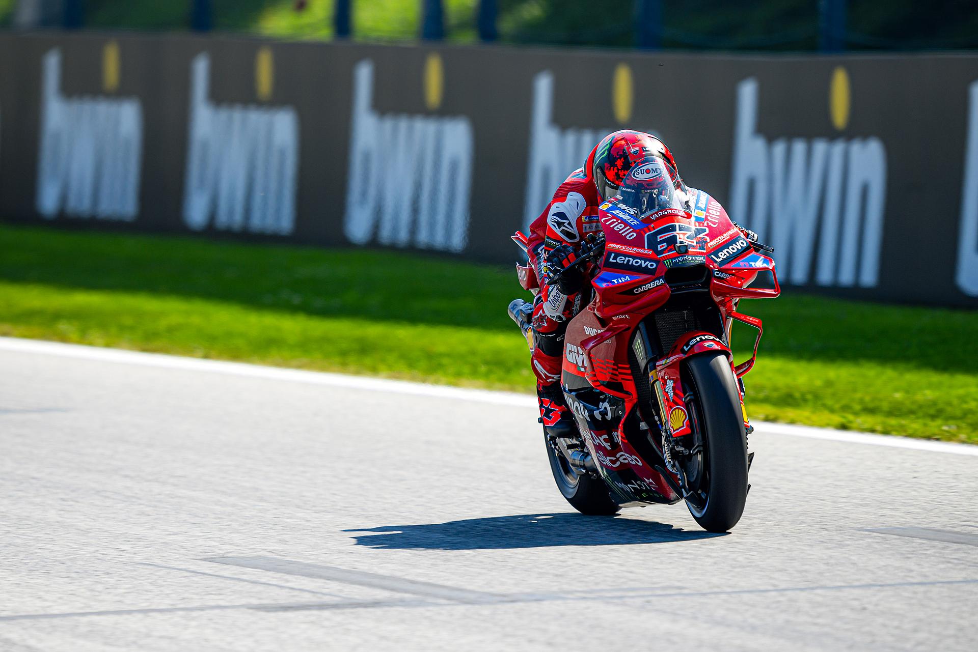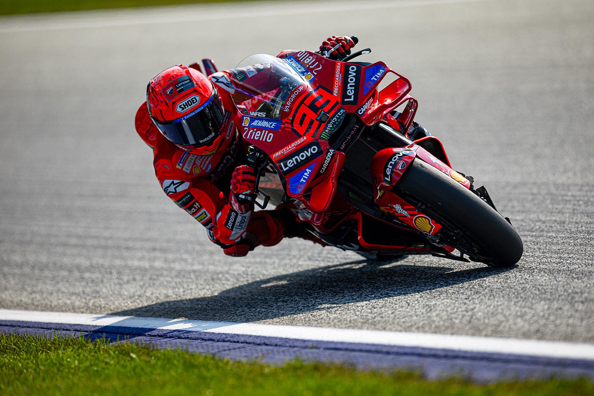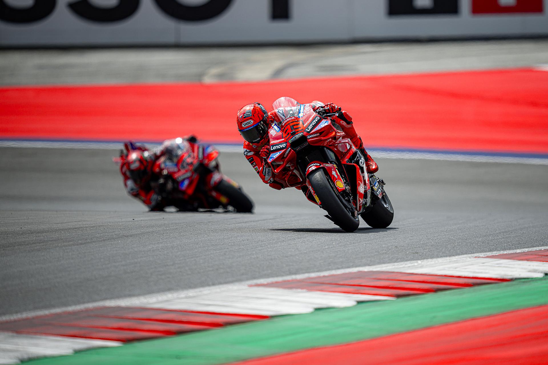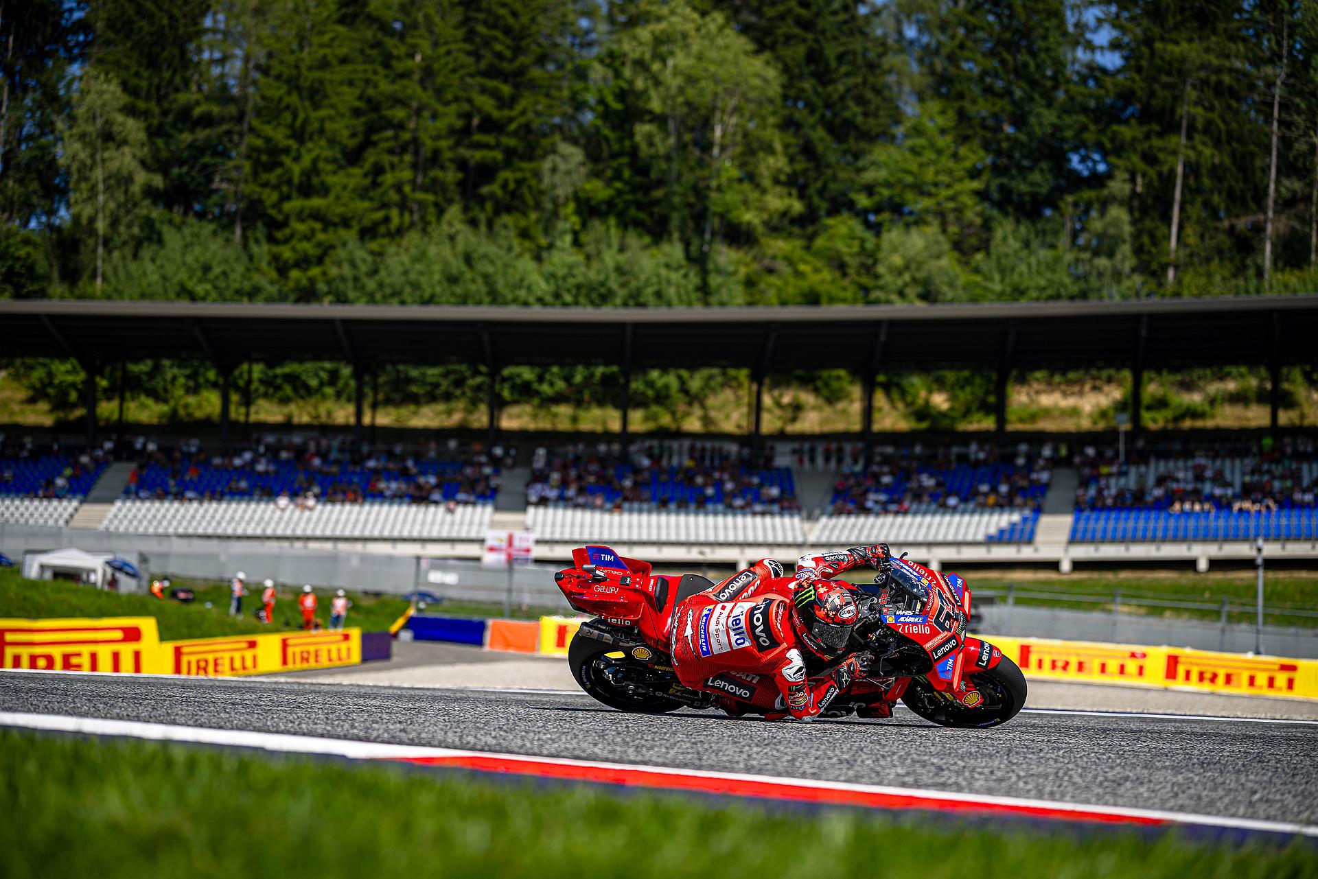Das Ducati Lenovo Team startete am Freitag auf der Rennstrecke von Spielberg in Österreich, Austragungsort des dreizehnten Grand Prix der Saison, mit starken Trainings-Sessions. Marc Márquez führte in beiden Sessions die Zeitenlisten an, Francesco Bagnaia beendete das Training auf dem dritten Platz. Márquez konzentrierte sich auf die Rennabstimmung seiner Desmosedici GP-Maschine und blieb während der gesamten Nachmittagssitzung in der Spitzengruppe. Zwei Minuten vor Schluss fuhr Marc eine Zeit von 1:28,117 und lag damit 0,228 Sekunden vor seinem nächsten Verfolger. Bagnaia, der am Morgen Zweitschnellster war, zeigte ein ausgezeichnetes Gefühl für die Strecke und führte die erste Hälfte des Trainings an, bevor er sich schließlich einen direkten Startplatz für Q2 sicherte.