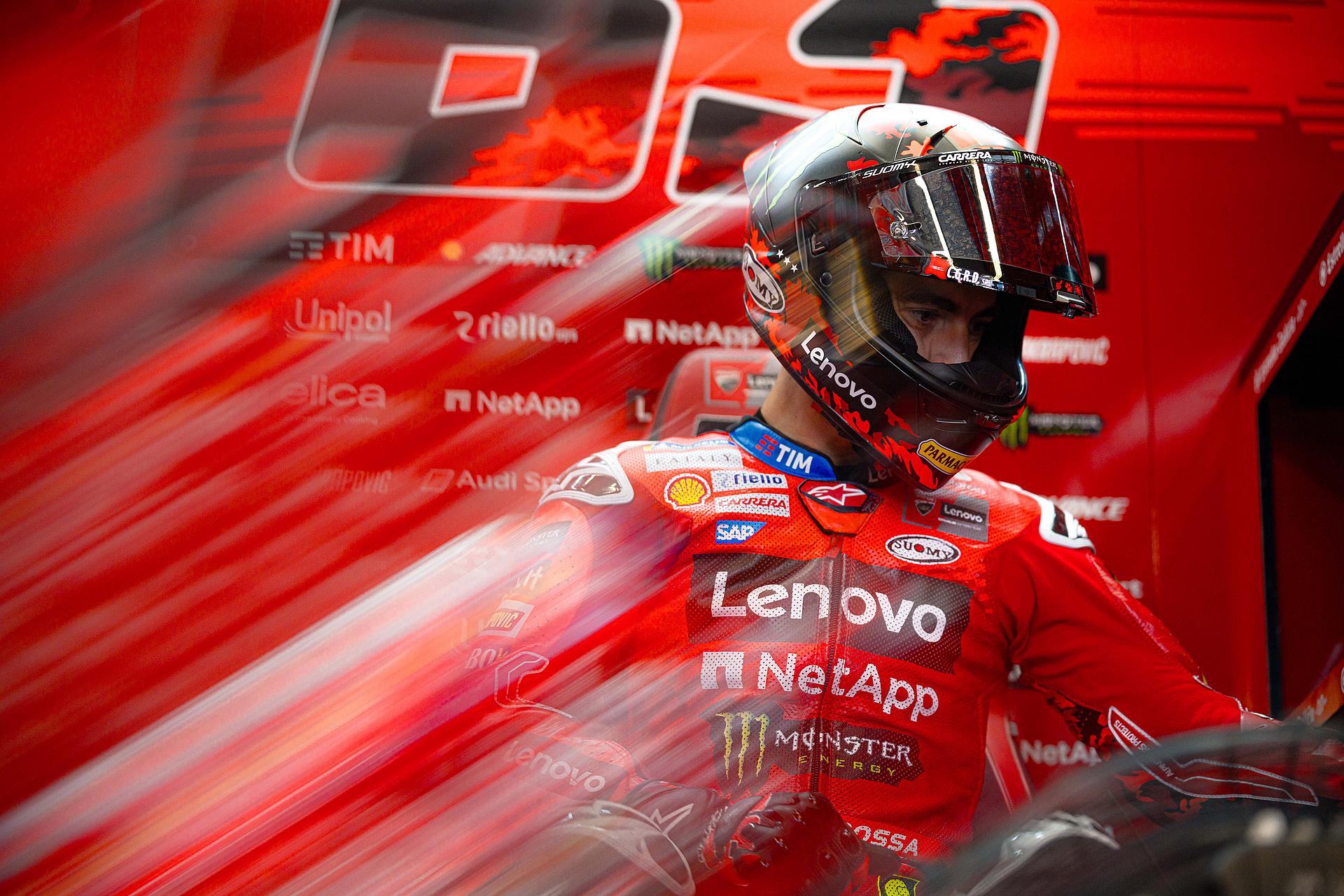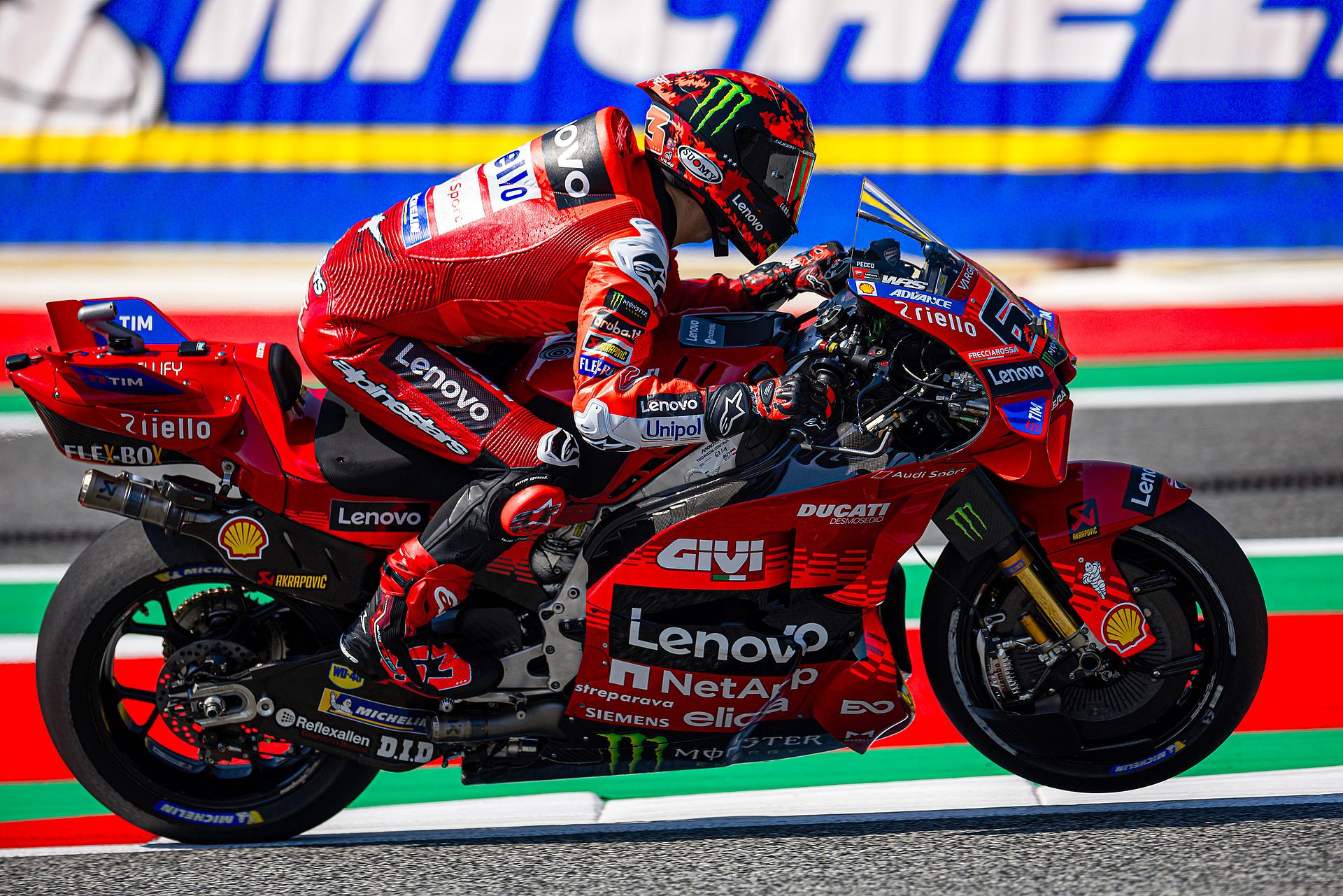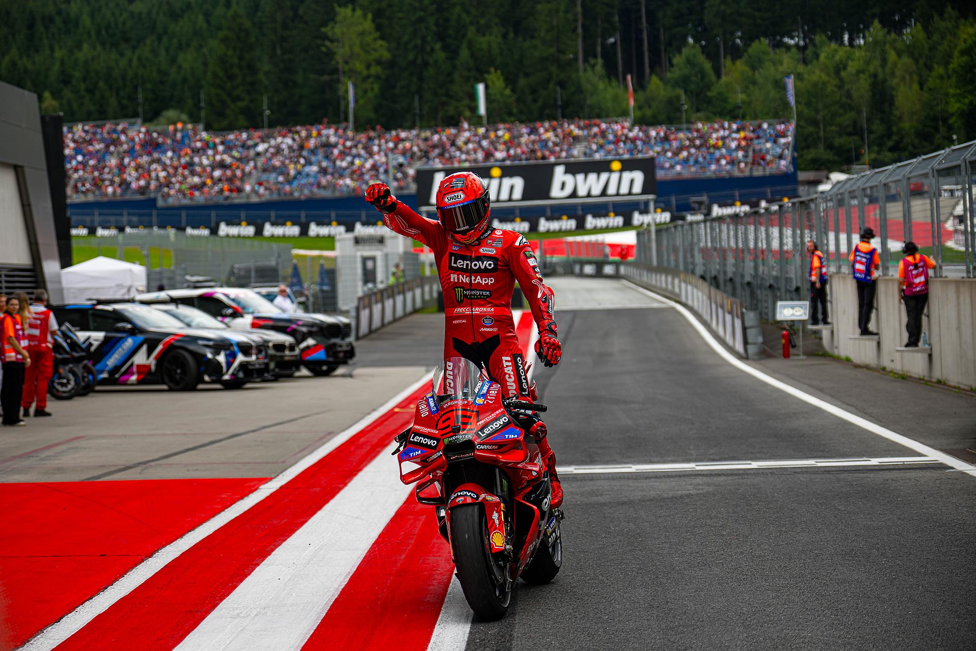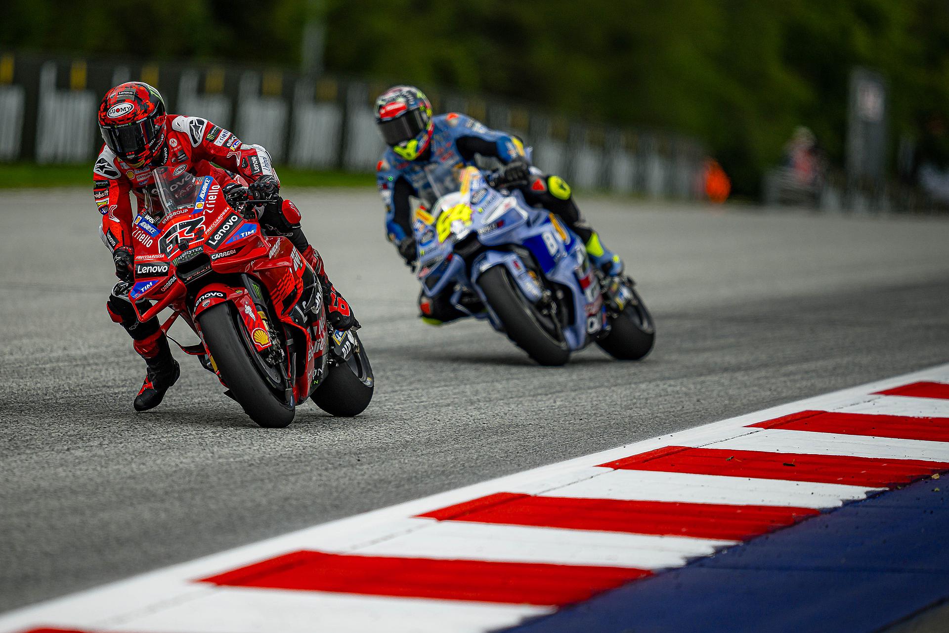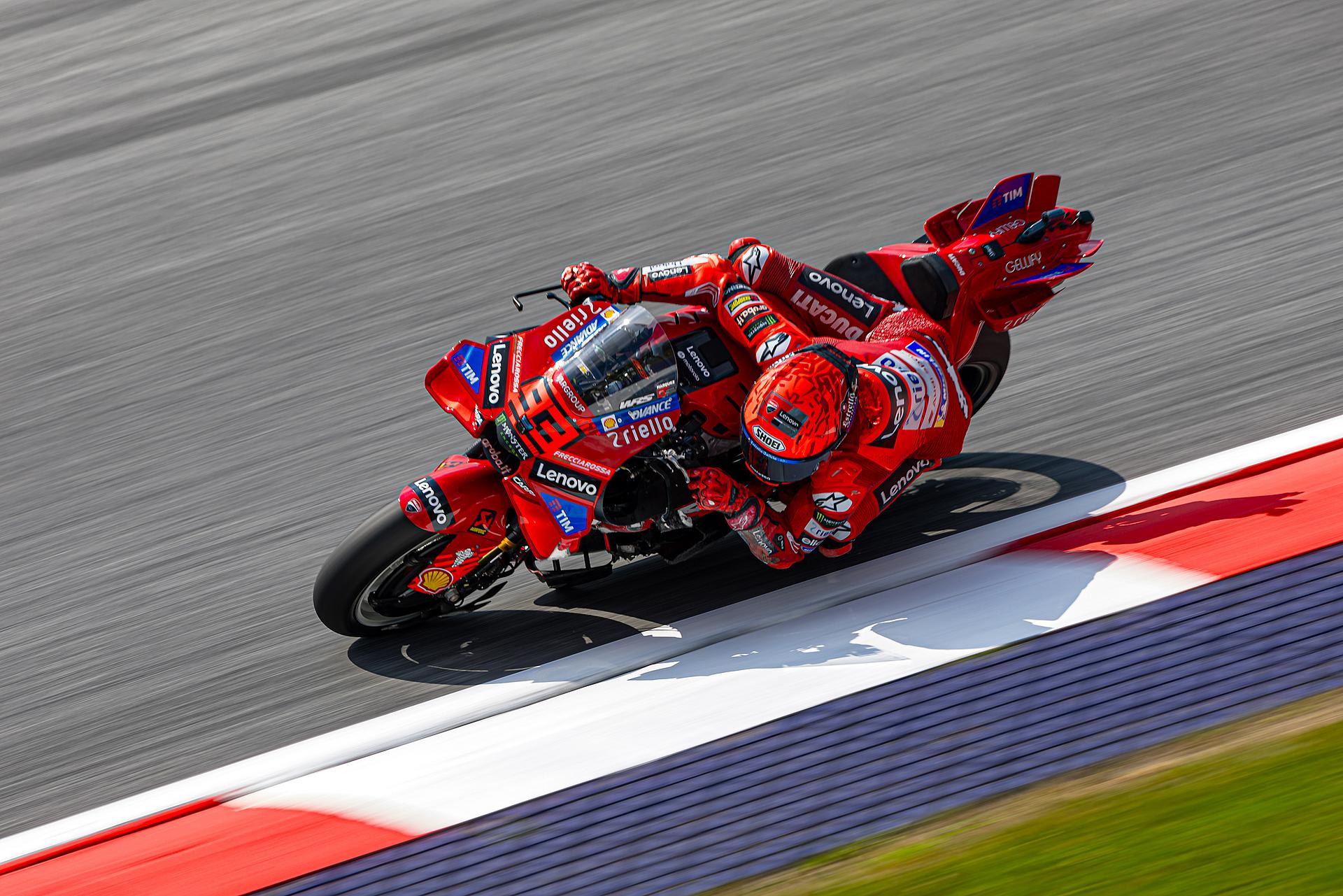 Das Ducati Lenovo Team startete am Freitag auf der Rennstrecke von Spielberg in Österreich, Austragungsort des dreizehnten Grand Prix der Saison, mit starken Trainings-Sessions. Marc Márquez führte in beiden Sessions die Zeitenlisten an, Francesco Bagnaia beendete das Training auf dem dritten Platz. Márquez konzentrierte sich auf die Rennabstimmung seiner Desmosedici GP-Maschine und blieb während der gesamten Nachmittagssitzung in der Spitzengruppe. Zwei Minuten vor Schluss fuhr Marc eine Zeit von 1:28,117 und lag damit 0,228 Sekunden vor seinem nächsten Verfolger. Bagnaia, der am Morgen Zweitschnellster war, zeigte ein ausgezeichnetes Gefühl für die Strecke und führte die erste Hälfte des Trainings an, bevor er sich schließlich einen direkten Startplatz für Q2 sicherte.