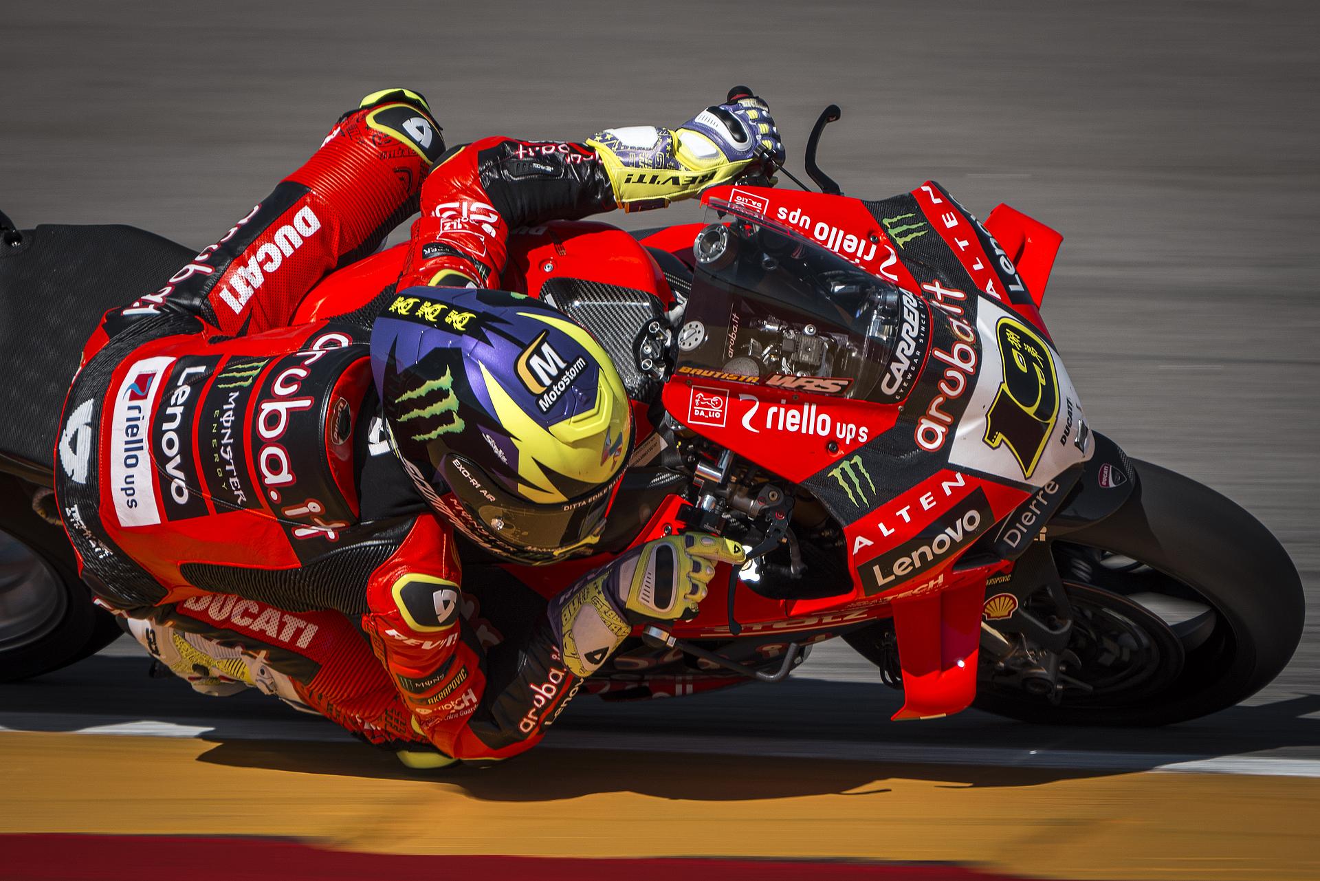 Die zehnte Runde der WorldSBK-Saison 2025 im Motorland Aragon begann am Freitag für das Team Aruba.it Racing - Ducati überzeugend. Nachdem Nicolò Bulega am Morgen, der von eher tiefen Temperaturen geprägt war, den zweiten Platz im FP1 belegt hatte, gelang es ihm am Nachmittag, sich mit seiner Ducati Panigale V4R noch weiter zu verbessern. Er beendete das FP2 mit einer Zeit von 1:48,736 und belegte damit den zweiten Platz in der Gesamtwertung.